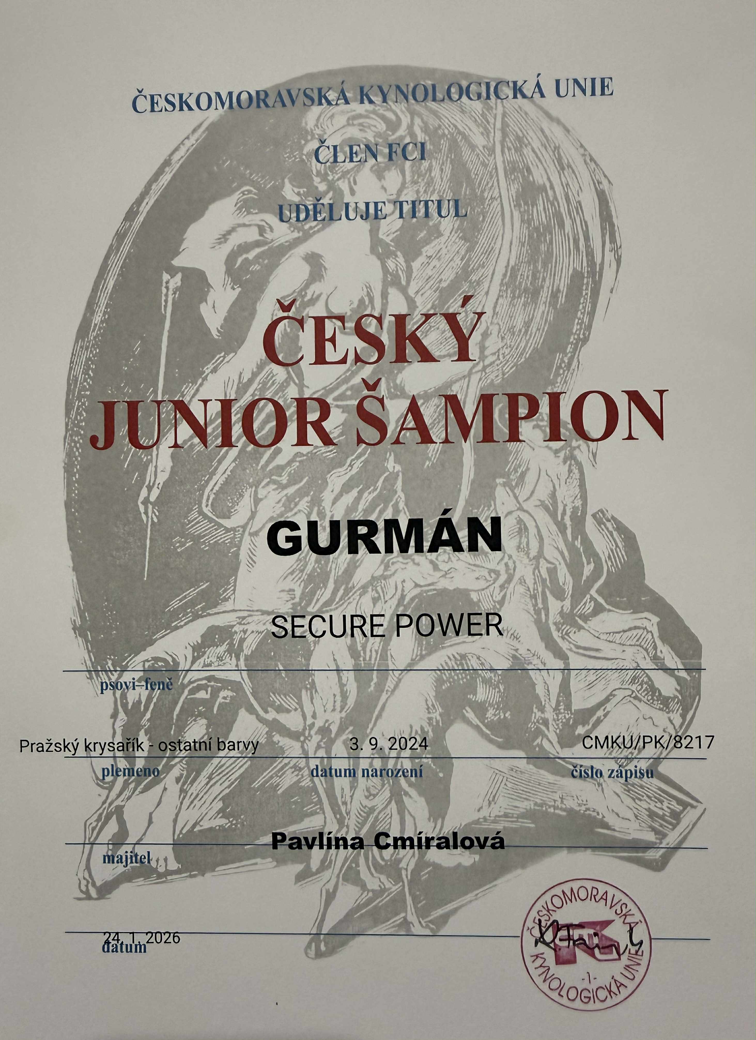 - Gurmán Secure Power: mezitřída: výborný 1, CAC – Český Junior šampion