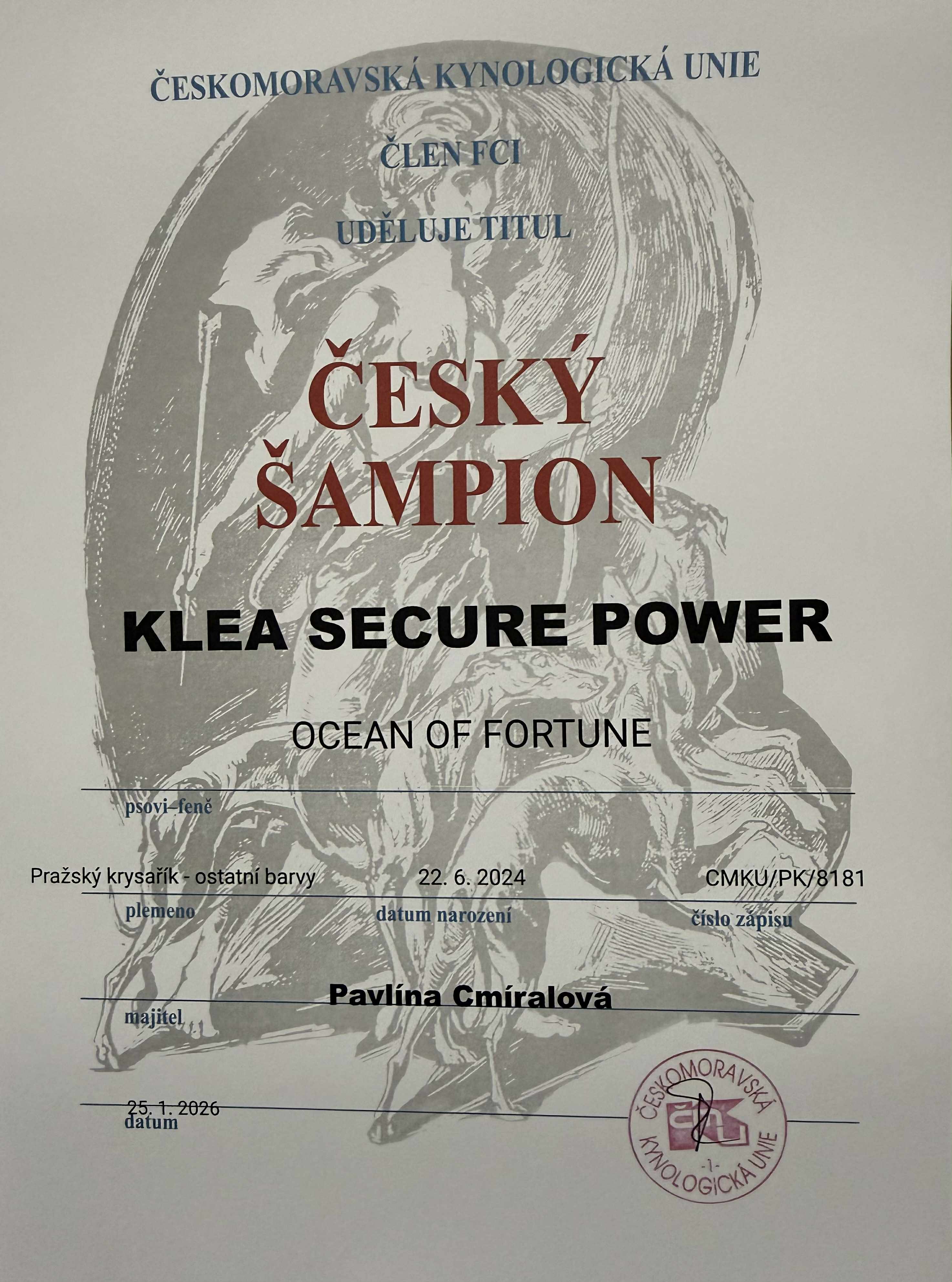 - Klea Secure Power Ocean of Fortune : mezitřída: výborná 1,CAC,BOB – Český šampion